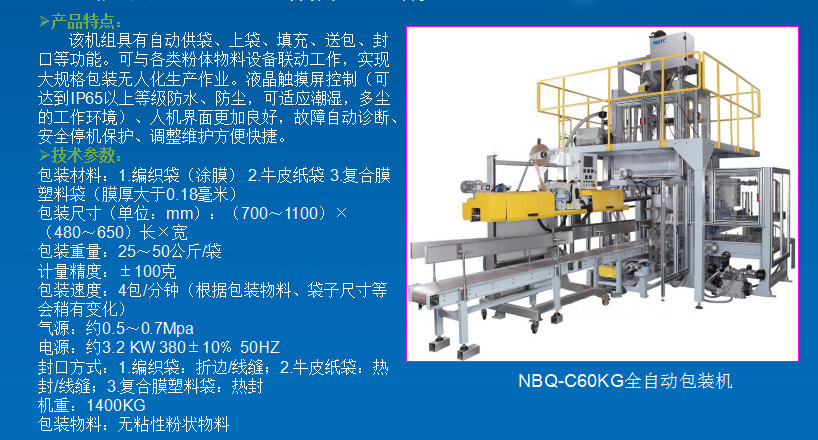 本机除人工套袋外,快慢加料、定量、夹袋、卸袋全部采用自动控制。仪表上实现快、慢加料量、控制参数的设置和超差报警显示;重量累计,并可配备自动打印输出。该设备具有称量速度快、准确度高、稳定性好、操作简便等特点。根据物料性质,黏度大的物料可以设计锥形给料斗,带破拱转轴与垂直螺旋加料机构实现粗细快慢加料。