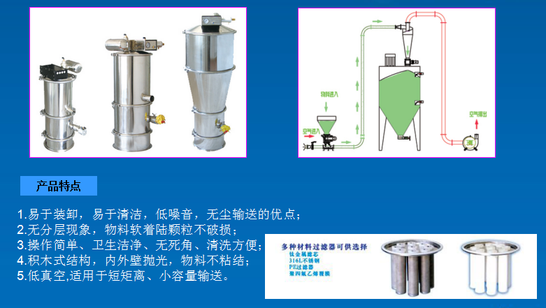 真空上料机又称真空输送机,是一种借助于真空吸力来传送颗粒和粉末状物料的无尘密闭管道输送设备,利用真空与环境空间的气压差,形成管道内气体流动,带动粉状物料运动,从而完成粉体的输送。我国引进先进的国外真空技术,不断完善,不断改进,现广泛用于化工、制药、食品、冶金、建材、农副等各轻、重工业行业。